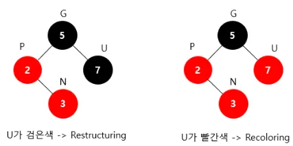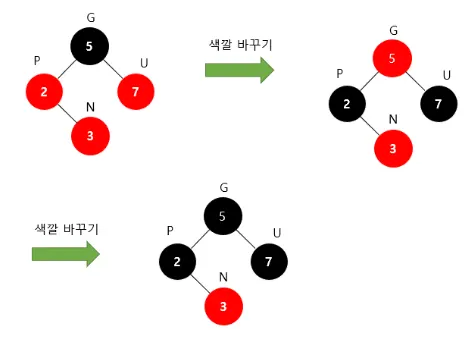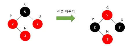 새로운 노드(N)의 부모(P)와 삼촌(U)을 검은색으로 바꾸고 조상(G)을 빨간색으로 변경