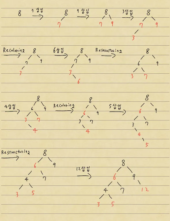 조상(G)을 빨간색으로 바꿨을 때 또다시 Double Red가 발생한다면 또다시Restructuring 혹은 Recoloring을 진행해서 Double Red 문제가 발생하지 않을 때까지 반복